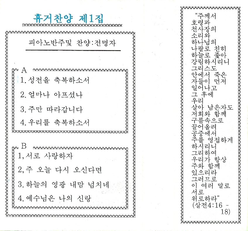 성전을 축복하소서 찬양 : 전 실비아 명자 성전을 축복하소서 찬양 전명자목사 Episode 63 찬양 휴거찬양 제1집 중에서 "성전을 축복하소서" 전실비아명자목사 425-791-6161 nujunbi@hotmail.com www.nujunbi.org 시애틀늦은비교회 Nujunbi World Ministries Podcast Please press the play button 전실비아 목사의 오디오 찬양을 들으시려면 위의 박스속의 Play 단추를 누르시거나 아니면 아래 늦은비 파도마틱을 클릭하십시요 http://nujunbi.podomatic.com/player/web/2009-06-28T22_37_32-07_00 www.nujunbi.org www.nujunbi.org 주님사랑 영원히